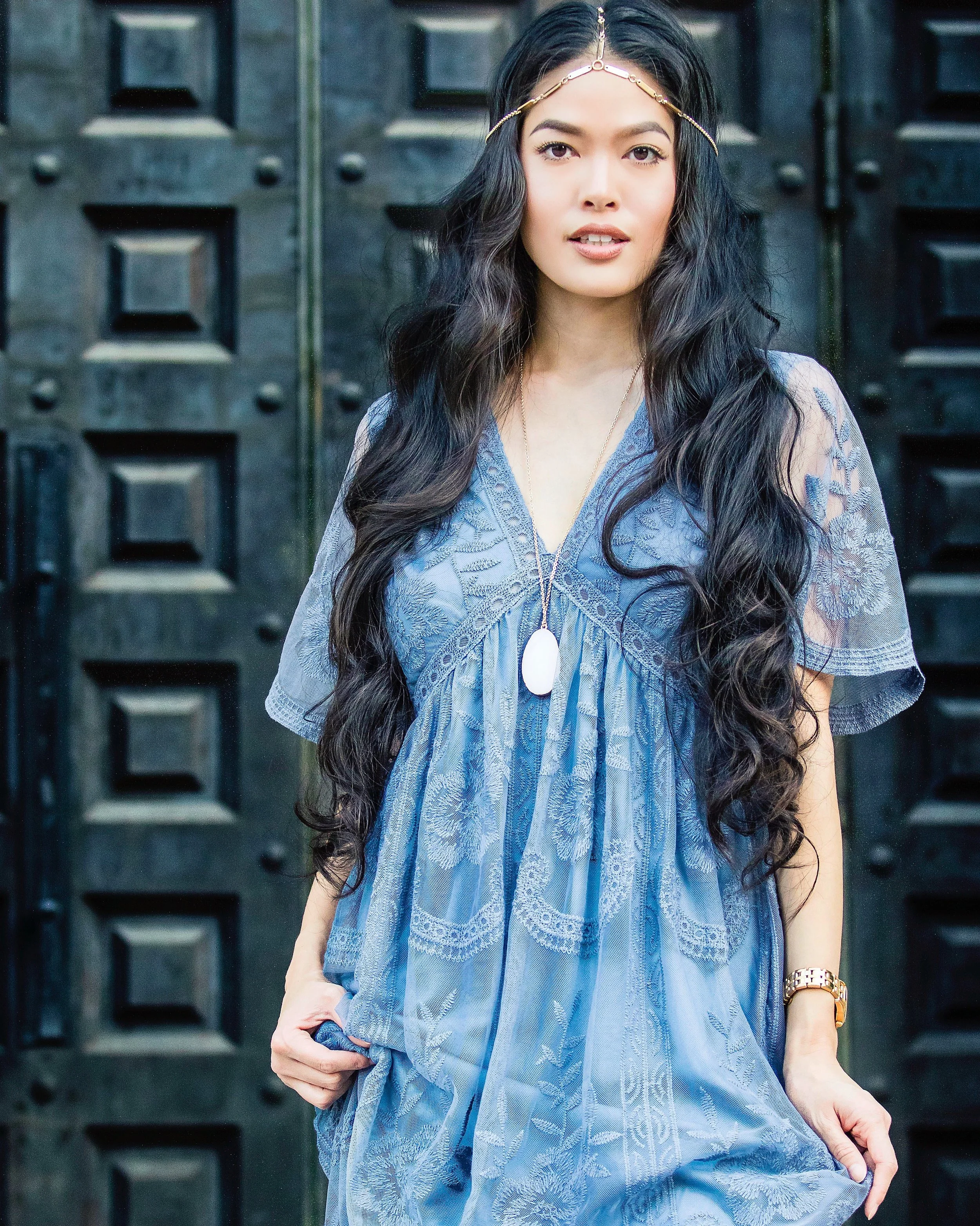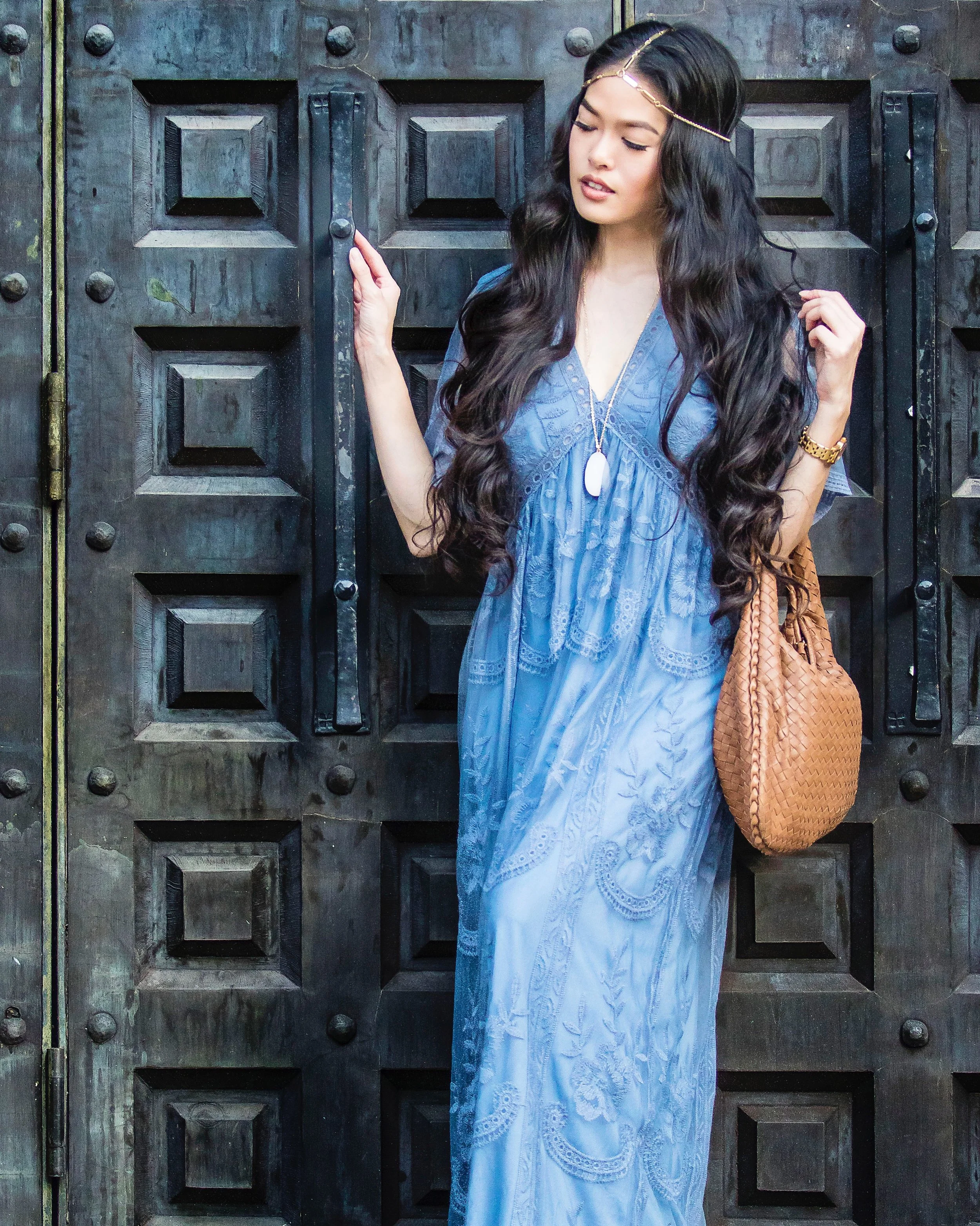 Adding that final touch with some shiny, gold accessories! Again, sorry but I found some of these items on sale years ago so the exact items I'm wearing are sold out. :( I got the headpiece from a Nasty Gal sample sale in LA for $15, and my Versace watch was on sale for $500 online at Amazon. My white stone pendant necklace is from Charming Charlie...I love their shop because everything is color coordinated and their jewelry is super affordable! I love pairing the long lariat style necklaces with maxi dresses because I think it compliments the length of the look, but you can always style it with some dainty jewelry if you prefer. I usually like chokers since Savannah pulls on my jewelry, but this long druzy necklace looked better with the look I was going for. Plus, the necklace is a great distraction when we're out waiting for food or when I'm nursing her...so it's a #momwin! :)