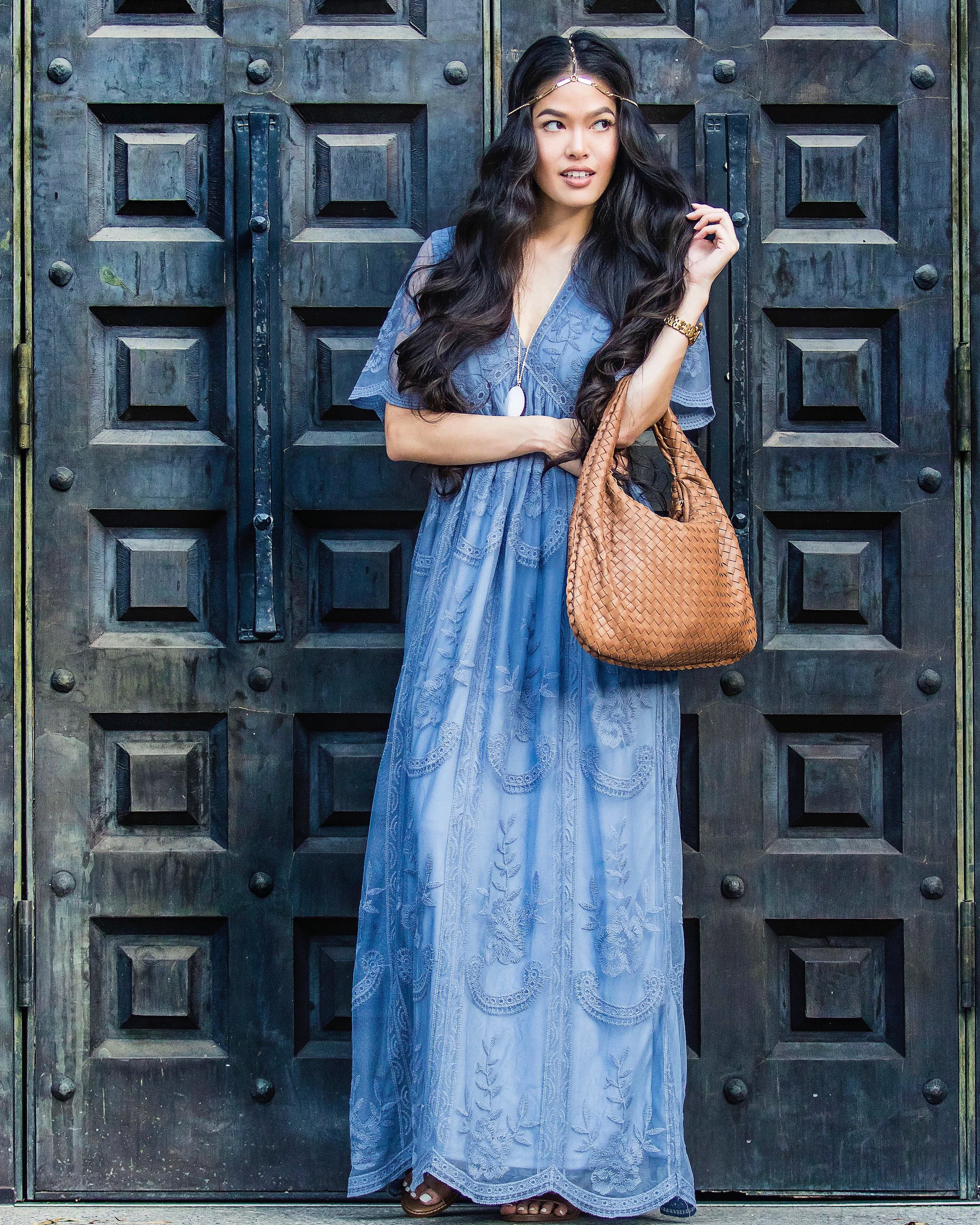 This blue lace mesh overlay maxi dress from Pinkblush has all the pretty details!! I seriously fell in love with it when I saw it online! It has a v-neckline (that's not too lowcut) and super cute scalloped edges! The back of this dress has a long zipper closure and is unlined at top so I prefer to wear it without a bra to show off the mesh embroidery. I love wearing dresses even in the Fall and Winter paired with an oversized cardigan or leather jacket. I don't normally shop as often after I had Savannah because my style has changed a bit and I'm picky with the way things look on me. But I'm obsessed with this dress as it's easy to style and super comfy to wear!